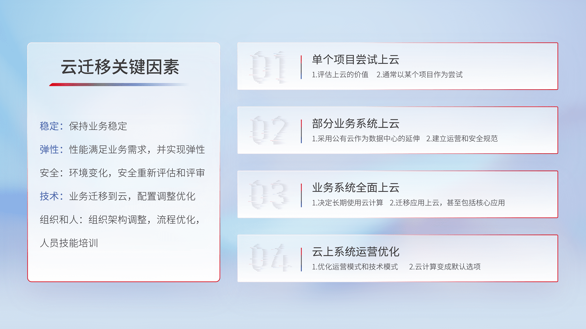 结合实际业务,,,,从规划设计、、、云平台选型、、云原生改造、、数据迁移、、集成交付,,,,迁移全过程为客户识别最佳上云路径,,做好风险识别管理,,,,设计网络架构、、、身份权限、、、、安全审计合规、、操作审计、、、、日志审计、、、监控告警策略、、、多站点容灾设计等,,,对云上基础设施进行整体规划,,,提升IT治理水平,,,以满足弹性、、、高可用、、、、高性能的需求。。