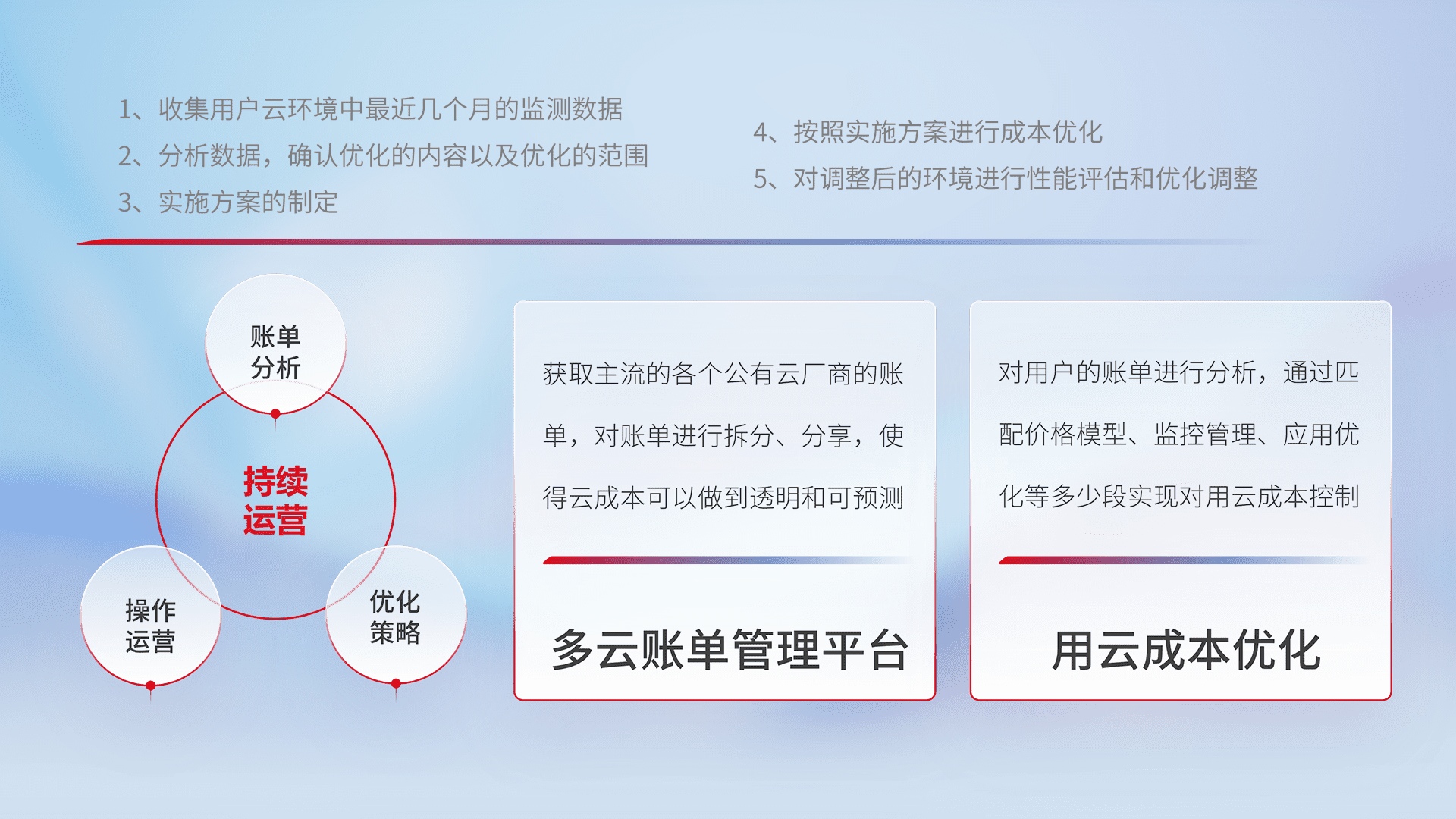 通过多云纳管,,以统一的资源数据模型把客户的云资源进行抽象和封装,,,,进而实现对多云资源的统一操作,,,保障云资源管理的可靠性、、稳定性与可用性。。。。量身定制化运维内容,,,配置、、、开发运维、、、、补丁管理、、备份、、、监控、、认证和访问管理、、、审计和日常巡检等,,,,保障在用云过程中的可靠度,,,,稳定度以及高可用率。。。。
